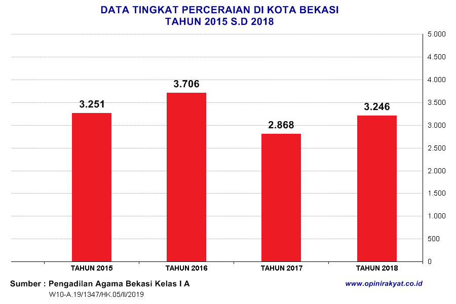 BEKASI – Data tingkat perceraian di Kota Bekasi empat tahun terakhir menunjukkan turun – naik. Berdasarkan data Pengadilan Agama Kota Bekasi Kelas IA, diketahui tingkat perceraian di tahun 2018 sebanyak 3.246 orang, meningkat dibanding tahun sebelumnya.