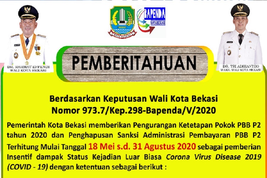 Fasilitas keringanan pajak tersebut diatur dalam Keputusan Walikota Bekasi Nomor 973.7/Kep.298-Bapenda/V/2020 tentang Pemberian Insentif atas Dampak Status Kejadian Luar Biasa Covid-19.