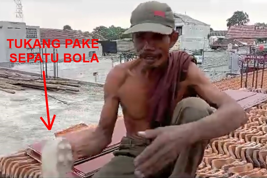 Yang lebih hebatnya lagi, pekerja terlihat sedang bekerja menggunakan sepatu yang diduga SEPATU BOLA.