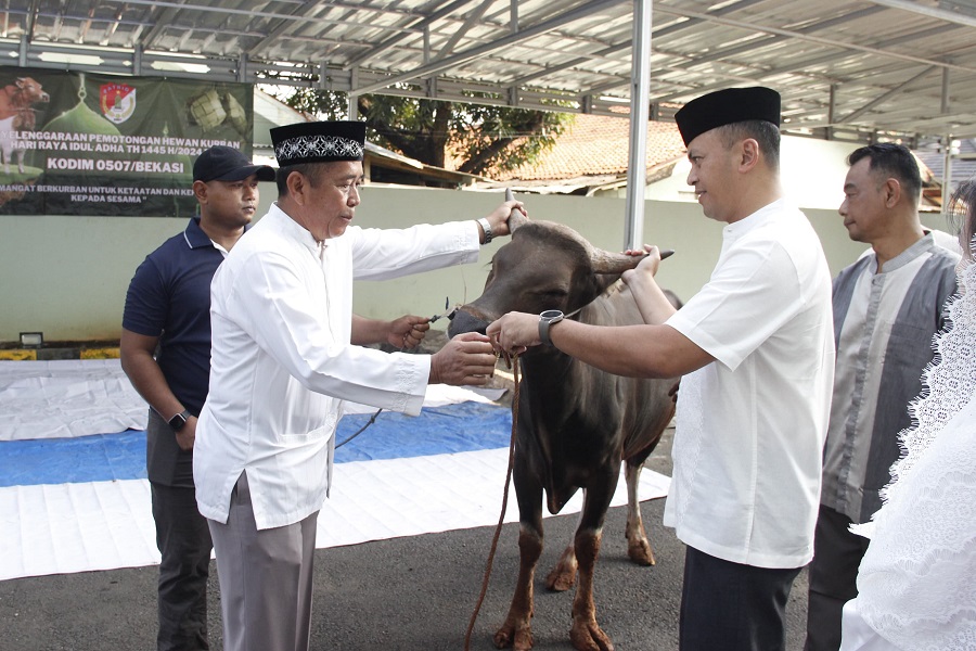 BEKASI – Memperingati Idul Adha 1445H, Kodim 0507 Bekasi menyelenggarakan penyembelihan hewan qurban, pada Senin (17/6/2024).