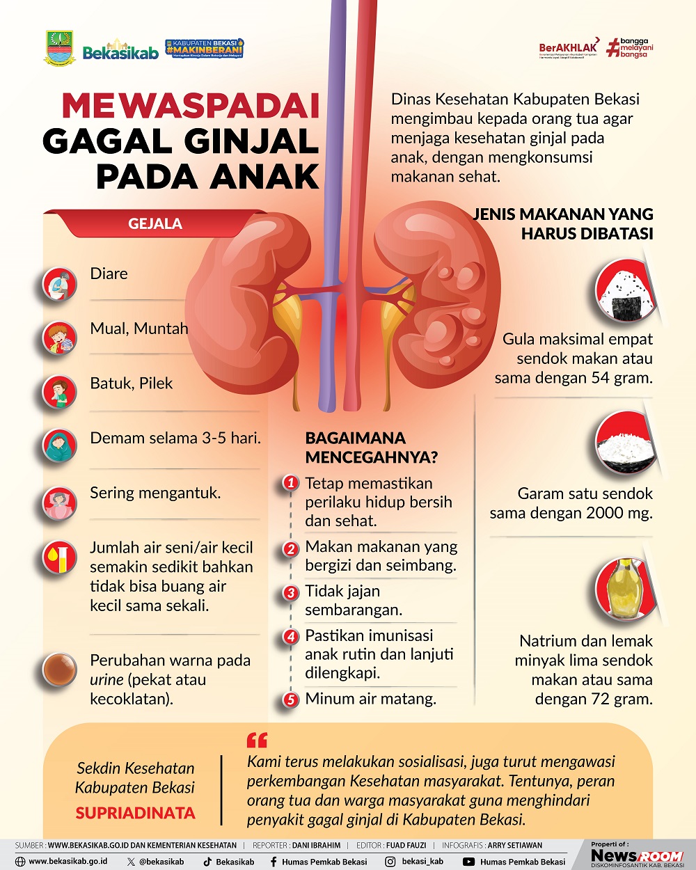 Sekretaris Dinas Kesehatan, Supriadinata mengatakan penting untuk membatasi konsumsi gula, garam, dan lemak guna menjaga kesehatan ginjal.