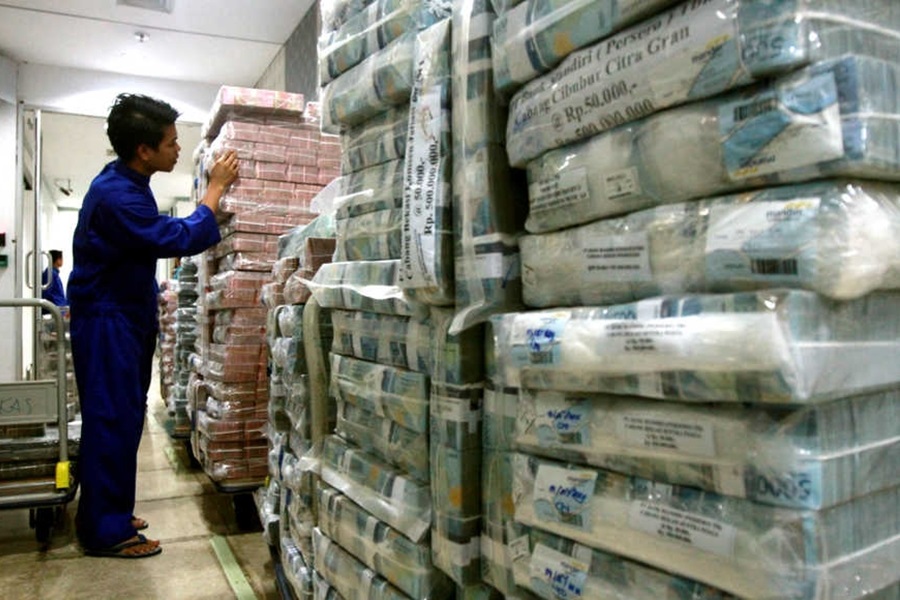 Dari nilai itu, sekitar 82% dialokasikan untuk memenuhi kebutuhan mesin ATM Mandiri dan 18 persen akan ditempatkan di kantor-kantor cabang. Terlihat seorang karyawan sedang memeriksa pasokan uang di Cash Pooling Bank Mandiri, Jakarta 09/05/2019.